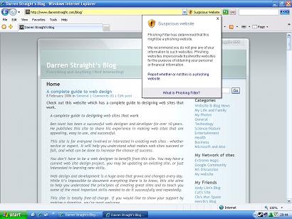 Well it seems as IE7 (Internet Explorer 7) has classified my Blog as a suspicious phishing website!