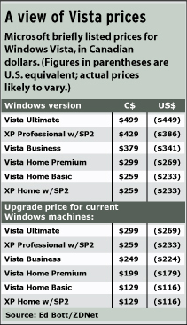Microsoft on Monday briefly posted pricing for Windows Vista on its Canadian Web site, giving an eye into what the company will charge for the new operating system.