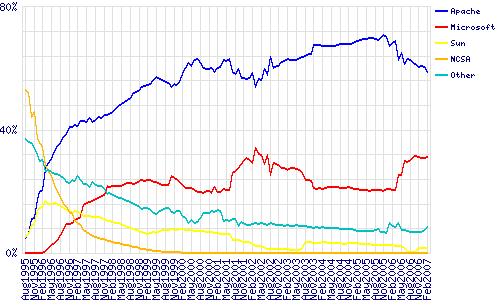 In the February 2007 survey we received responses from 108,810,358 sites, an increase of 1.93 million from last month. Apache has a decline of 442K sites this month, and sees its share of the web server market slip by 1.47 percent to 58.7 percent. This is the first time Apache’s market share has been below 60 percent since September 2002.