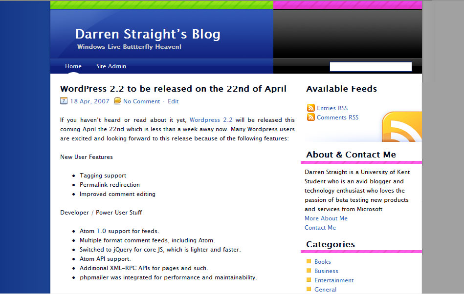 Well after much thorough testing (after the fiasco last time) I’ve now upgraded my blog to WordPress 2.1.3, and in addition to that addition I’ve also updated the blog theme from Lush v0.99.8 to Fresh-Compact v1.2 with some added improvements from Praveen Kumar’s version as well as some of my own improvements.