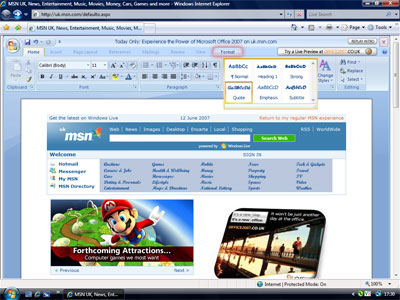 Today Microsoft Office and MSN UK are joining forces to unveil what was called the most innovative online ad – ever: for 24 hours today, Tuesday 12th June, the MSN.co.uk website will be strikingly transformed to take the form of a Microsoft Office Word 2007 document, allowing customers to try the Live Preview for themselves in a very familiar environment.